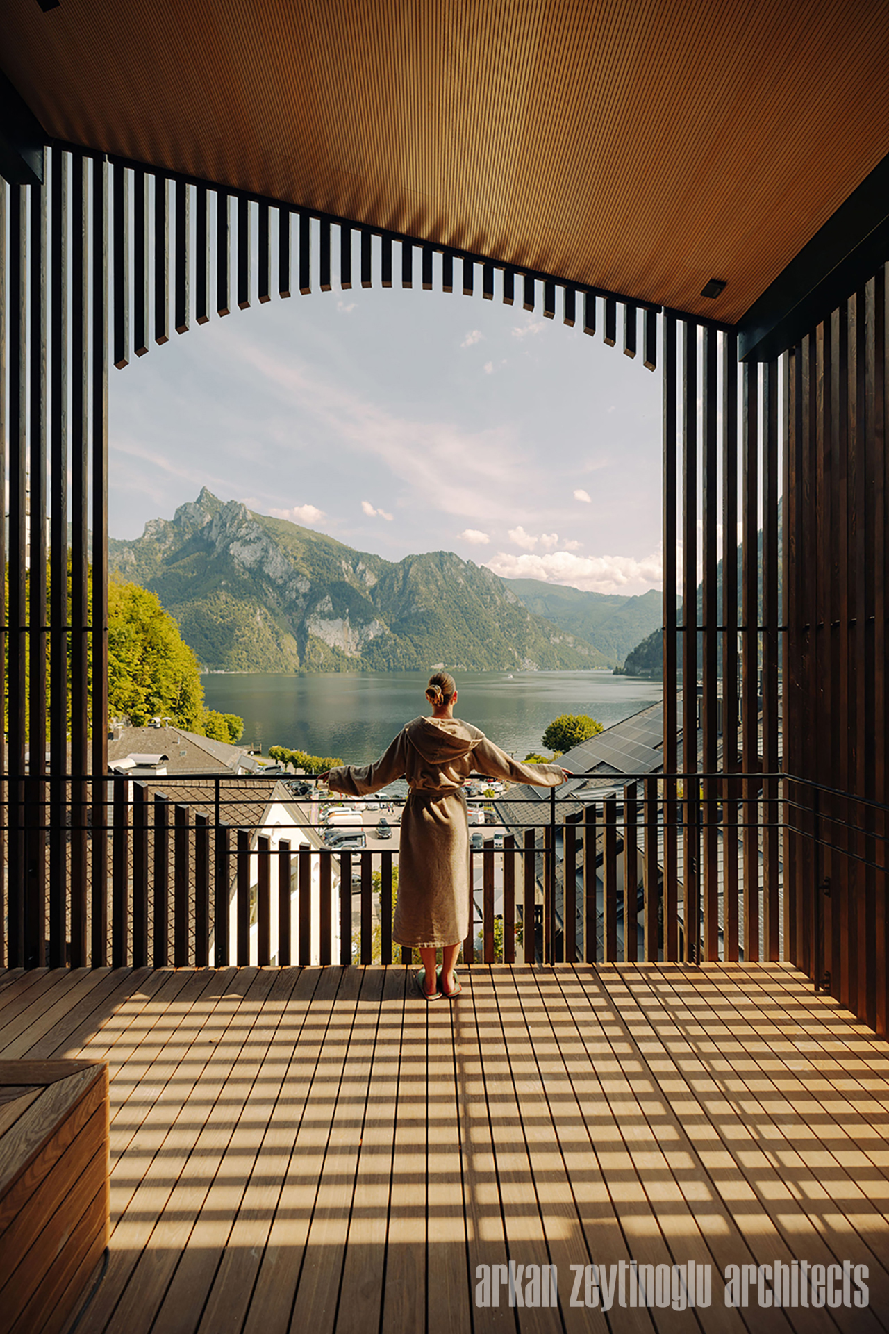 The wellness floor forms the “peak” of the new addition, with relaxation rooms, saunas, a steam bath, and an outdoor pool, allowing guests to experience views over Traunkirchen and Traunsee. With the new addition, the original structure of the old house was restored and will continue to make history in the future.